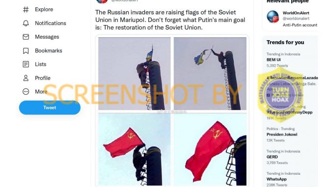 Akun Twitter @worldsonalert menyebarluaskan foto pada 18 April lalu, dengan keterangan bahwa penjajah Rusia mengganti bendera Ukraina dengan bendera Uni Soviet. @worldsonalert juga mengklaim bahwa foto tersebut diambil di Mariupol, Ukraina. Cuitan tersebut telah disukai 2,845 orang, dan dibagikan ulang serta dikutip sebanyak 1,000 kali.