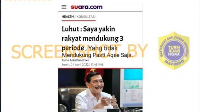 Akun Facebook ラーデン 有谷 グメラール pada 5 April 2022 pukul 16.18 memposting sebuah gambar tangkapan layar artikel milik Suara.com. Artikel tersebut berjudul “Luhut : Saya yakin rakyat mendukung 3 periode , Yang tidak Mendukung Pasti Aqee Saja.”.
