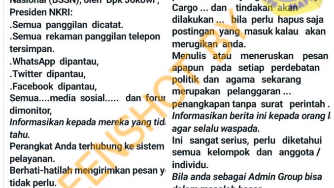 Beredar sebuah pesan berantai di aplikasi pesan Whatsapp yang berisi informasi pemantauan aktivitas telepon dan media sosial yang dilakukan oleh pemerintah. Pemerintah dalam hal ini melakukannya melalui Badan Sandi dan Siber Nasional (BSSN) yang telah dilantik oleh Presiden Joko Widodo.