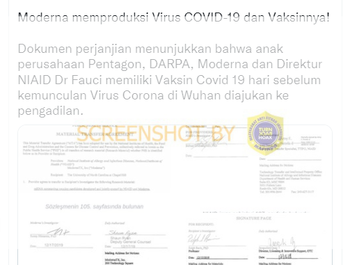 Beredar sebuah narasi oleh akun Twitter @yo2thok yang mengatakan bahwa perusahaan biofarma Moderna telah membuat produksi virus dan vaksin Covid-19 sebelum pandemi Covid-19 terjadi. Dalam narasi tersebut dilampirkan juga beberapa gambar dokumen “Material Transfer Agreement” antara National Institute of Allergy and Infectious Diseases (NIAID), Moderna dan University of North Carolina (UNC) di Chapel Hill. Dokumen tersebut tertandatangani pada 12 dan 17 Desember 2019.