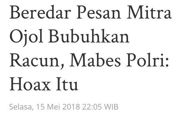Beredar informasi yang disebar melalui pesan berantai whatsapp bahwa mitra ojek online meracuni pesanan makanan milik konsumen. Menurut si pembuat pesan, hal itu dilakukan oleh anggota ISIS yang menyamar menjadi mitra ojol.