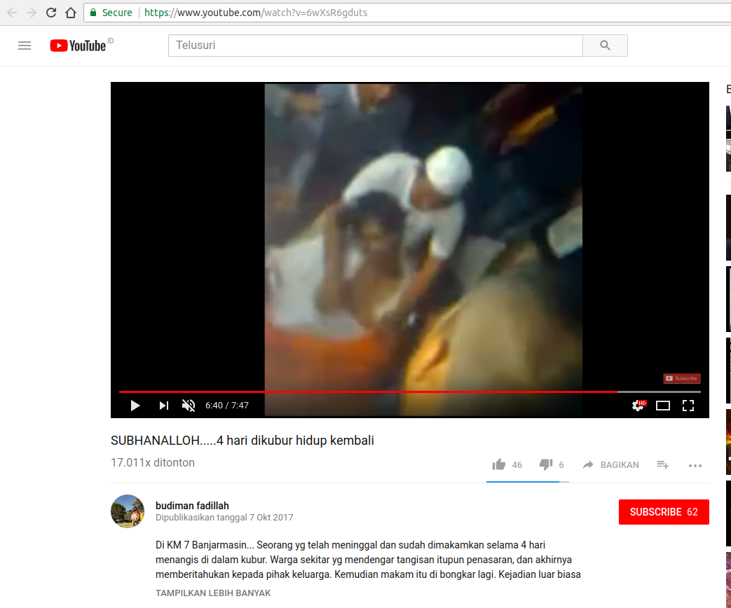 Di KM 7 Banjarmasin. Kalsel… seseorang yg telah meninggal dan sudah dimakamkan selama 4 hari menangis di dalam kubur. Warga sekitar yg mendengar tangisan itu penasaran. Dan ahirnya memberitahukan kepada pihak keluarga. Kemudian makam itu dibongkar lagi. Kejadian luar biasa terjadi. Ternyata orang itu hidup kembali…!!! Allah menunjukkan kekuasaan-Nya bahwa tidak ada yg tidak mungkin apabila Allah sudah berkehendak. Subhanallah. Subhanallah. Subhanallah.. . silakan saksikan sendiri tanpa rekayasa…!!!