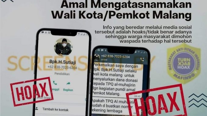 Beredar akun WhatsApp mengatasnamakan Wali Kota Malang Sutiaji. Akun WhatsApp tersebut menggunakan foto profil Wali Kota Malang Sutiaji memakai peci hitam dengan nomor WhatsApp “083870256204” dan mengirimkan pesan dengan tujuan menyalurkan donasi ke TPQ.
