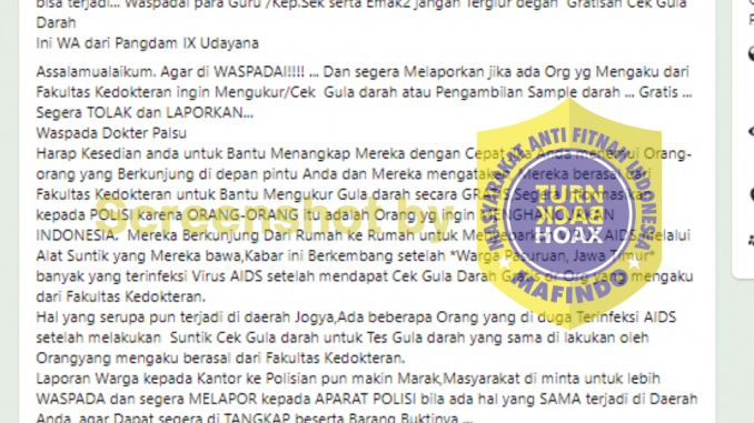 Harap Kesedian anda untuk Bantu Menangkap Mereka dengan Cepat jika Anda menemui Orang-orang yang Berkunjung di depan pintu Anda dan Mereka mengatakan, Mereka berasal dari Fakultas Kedokteran untuk Bantu Mengukur Gula darah secara GRATIS,Segera Informasikan kepada POLISI karena ORANG-ORANG itu adalah Orang yg ingin MENGHANCURKAN INDONESIA. Mereka Berkunjung Dari Rumah ke Rumah untuk Menyebarkan VIRUS AIDS melalui Alat Suntik yang Mereka bawa,Kabar ini Berkembang setelah Warga Pasuruan, Jawa Timur banyak yang terinfeksi Virus AIDS setelah mendapat Cek Gula Darah Gratis dr Org yang mengaku dari Fakultas Kedokteran.