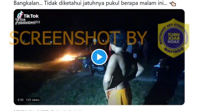 Akun Twitter @Wongcerbon9661 menulis cuitan bahwa sebuah meteor telah jatuh di lapangan Tanjung, Bumi Bangkalan, Jawa Timur pada 3 Mei lalu. Cuitan tersebut diikuti lampiran video TikTok yang menunjukkan seorang warga sedang menyaksikan kobaran api dan mengatakan bahwa api tersebut berasal dari meteor yang jatuh.