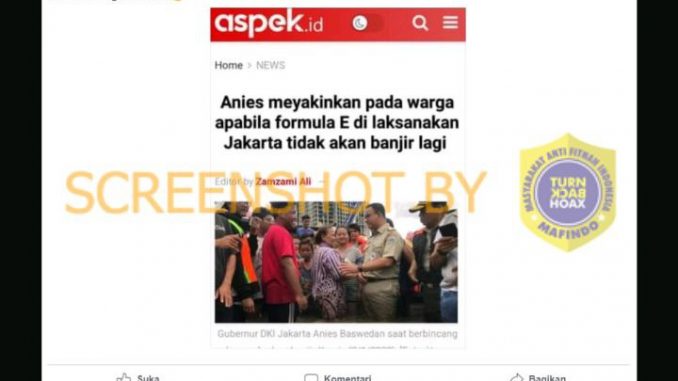 Akun Facebook Sandro Novan memposting sebuah gambar tangkapan layar artikel milik aspek.id. Artikel tersebut berjudul “Anies menyakinkan pada warga apabila formula E di laksanakan Jakarta tidak akan banjir lagi”.