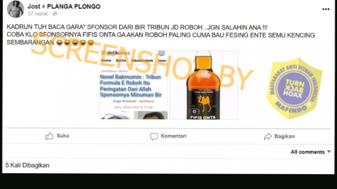 Akun Facebook Jost pada grub PLANGA PLONGO memposting gambar tangkapan layar artikel milik detiknews. Artikel tersebut berjudul “Novel Bakmumin : Tribun Formula E Roboh Itu Peringatan Dari Allah Sponosrnya Minuman Bir”.
