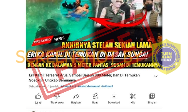 Berdasarkan hasil penelusuran, adanya video yang diberi judul “Eril Kamil Terseret Arus, Sampai Sejauh 800 Meter, Dan Di Temukan Sosok Ini” merupakan klaim yang salah.