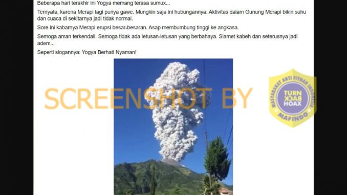 Akun Facebook bernama Among Kurnia Ebo memposting sebuah gambar yang diklaim sebagai erupsi Merapi pada sore hari tanggal 30 Mei 2022.