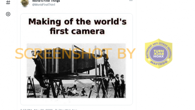 Akun Twitter World’s First Things (@WorldFirstThin1) mengunggah cuitan berupa foto yang di dalamnya terdapat narasi “Making of the world’s first camera” atau “Membuat kamera pertama di dunia”. Cuitan yang diunggah pada 26 Mei 2022 mendapat atensi berupa 291 suka dan 31 retweet.