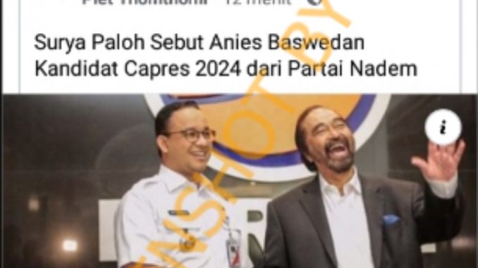 Beredar sebuah unggahan di media sosial Facebook dengan klaim yan menyebutkan bahwa Ketua Umum Partai Nasdem, Surya Paloh, menyebut bahwa Anies Baswedan adalah kandidat Calon Presiden (Capres) dari Partai Nasdem untuk pemilu 2024. Unggahan ini juga turut menyertakan sebuah artikel dengan judul yang senada.