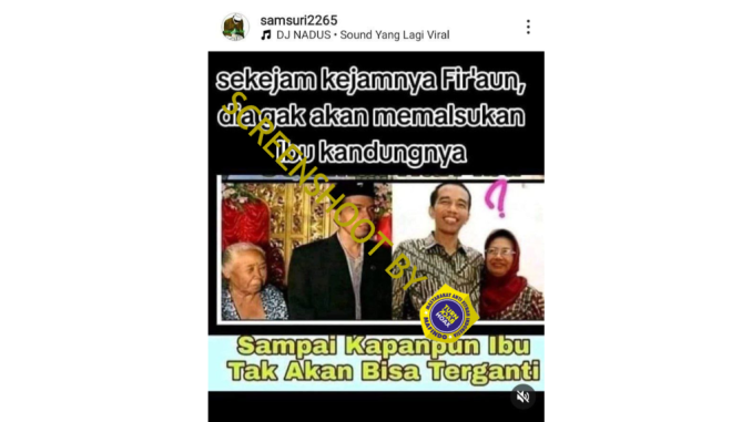 Sebuah akun X dengan nama pengguna @dancersejati07 mengunggah foto dengan klaim bahwa Presiden Jokowi memalsukan identitas ibu kandungnya. Dalam foto tersebut tampak Jokowi mengenakan setelan jas berdiri di samping wanita paruh baya mengenakan baju biru yang diklaim sebagai ibu dari Presiden Jokowi. Di satu sisi tampak Jokowi mengenakan baju batik bersama perempuan berjilbab. Diketahui perempuan yang mengenakan baju batik dan berjilbab tersebut bernama Sudjiatmi Notomihardjo yang merupakan ibu kandung Presiden Jokowi.
