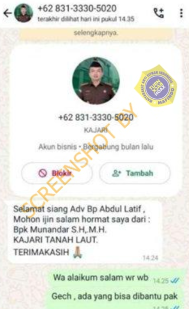 Sebagai informasi Munandar merupakan Kepala Kejaksaan Negeri Tanah Laut yang baru dilantik pada 11 September lalu. Dipastikan akun WhatsApp tersebut merupakan konten tiruan.