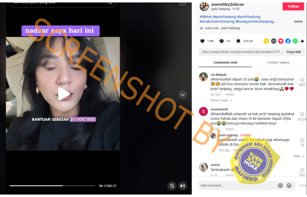 Beredar video dari akun TikTok “putri.tanjung55” [arsip postingan & arsip video] yang menunjukkan Putri Tanjung ingin membagikan bantuan Rp25 juta untuk warganet yang telah membagikan ulang unggahan dan mengikuti akun tersebut.