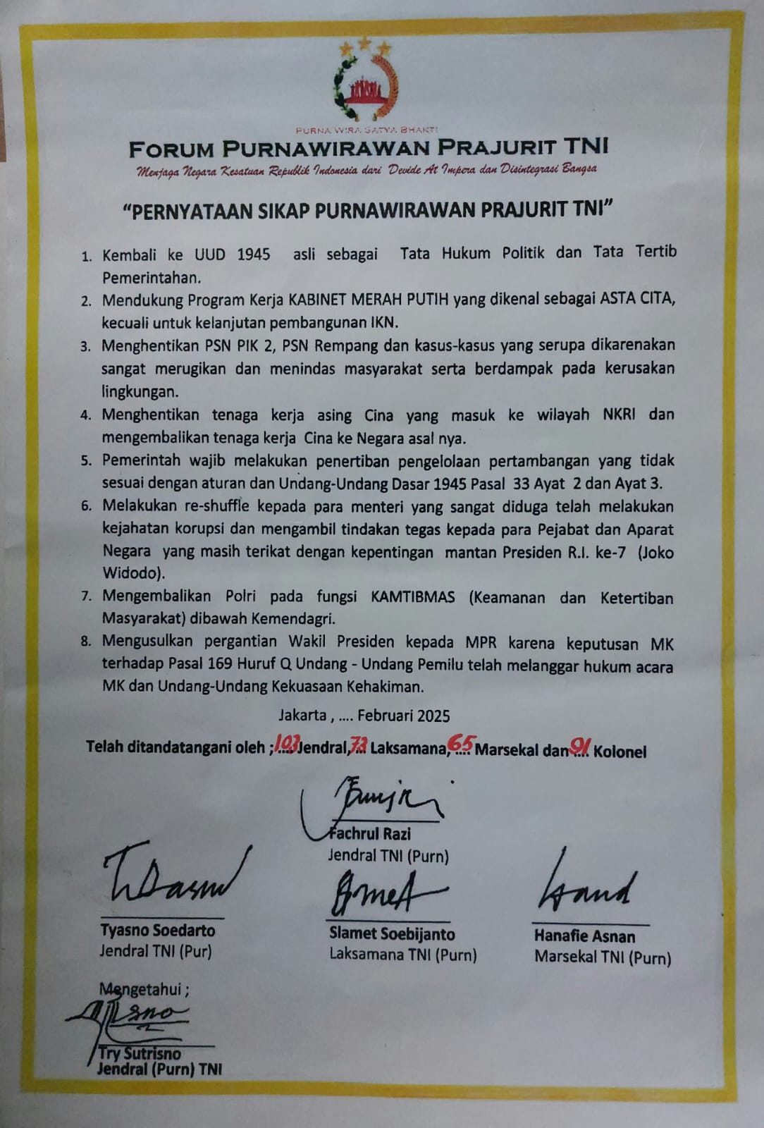 SEBUAH foto dokumen pernyataan sikap sejumlah purnawirawan dalam Forum Purnawirawan Prajurit TNI yang mengusulkan pergantian Wakil Presiden RI Gibran Rakabuming, beredar di WhatsApp.
