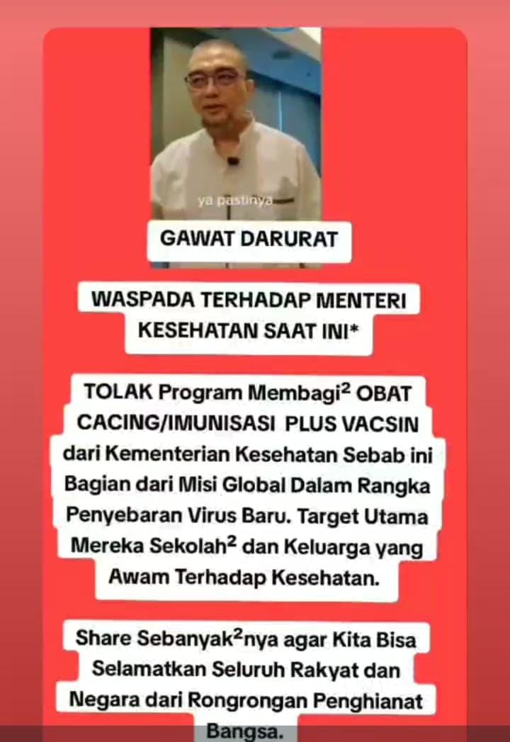 SEBUAH konten media sosial Facebook [arsip] memuat gambar dr. Agung Sapta Adi dengan narasi tentang penyebaran virus baru melalui obat cacing dan vaksin. Pesannya mengajak orang agar menolak program bagi-bagi obat cacing, imunisasi, dan vaksin dari Kementerian Kesehatan. Program tersebut disinyalir bagian dari misi global untuk menyebarkan virus baru.