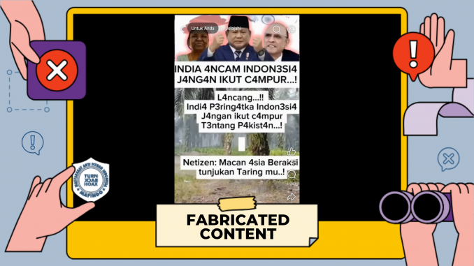 Unggahan dengan klaim “India mengancam Indonesia agar tidak ikut campur urusan India-Pakistan” adalah konten palsu (Fabricated Content). Pemerintah Indonesia hanya menyerukan perdamaian dan dialog atas konflik India-Pakistan, serta mengimbau warganya untuk berhati-hati di kawasan tersebut. Tidak ada catatan Indonesia ikut campur secara langsung dalam konflik tersebut.