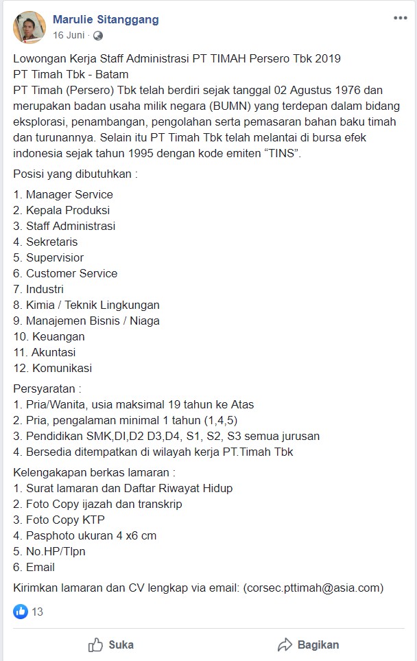 Beredar informasi lowongan pekerjaan atas nama perusahaan PT Timah (Persero) Tbk. Dalam informasi itu disebutkan bahwa PT Tima tengah membutuhkan pekerja di beberapa bidang. Adapun, di akhir informasi tersebut terdapat alamat surel (surat elektronik) atau email corsec.pttimah@asia.com.