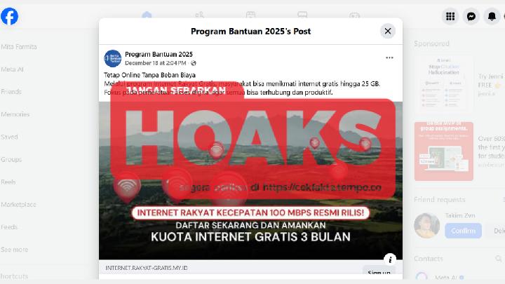 INFORMASI mengenai peluncuran program internet rakyat gratis, beredar di Facebook [arsip] pada 18 Desember 2025. Informasi itu dilengkapi dengan tautan https://internet.rakyat-gratis.my.id/ yang diklaim sebagai situs pendaftaran untuk mengakses internet gratis selama tiga bulan hingga 25 GB.
