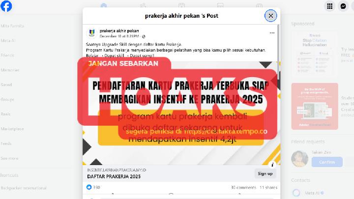 AKUN Facebook [arsip] menyebarkan informasi bohong mengenai pembukaan pendaftaran Kartu Prakerja 2025 pada 18 Desember 2025. Unggahan tersebut mencantumkan tautan pendaftaran palsu dengan alamat https://insentif.layananprakerja.my.id/.