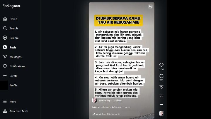 Diunggah pada 21 Desember 2025, video tersebut sudah ditonton lebih dari 80.900 kali, disukai 5.600 pengguna, dan mendapat 229 komentar. Namun, benarkah air rebusan mie instan berbahaya seperti klaim dalam narasi?