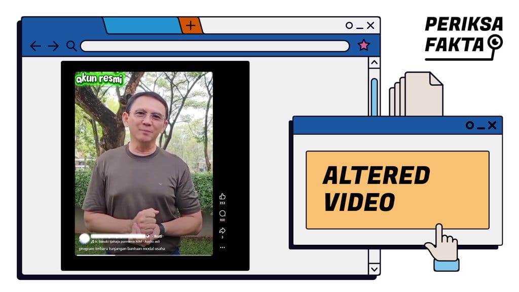 Video tersebut menampilkan sosok yang menyerupai Ahok sedang menyampaikan informasi terkait bantuan modal usaha. Dalam tayangan itu, terlihat Ahok mengenakan baju berwarna hijau tua dengan latar belakang yang menyerupai area taman.