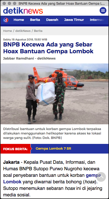 "Jakarta - Kepala Pusat Data, Informasi, dan Humas BNPB Sutopo Purwo Nugroho kecewa soal penyebaran bantuan untuk korban gempa Lombok yang diwarnai berita bohong (hoax). Sutopo menemukan sebaran hoax ini di jejaring media sosial.", selengkapnya di bagian REFERENSI.