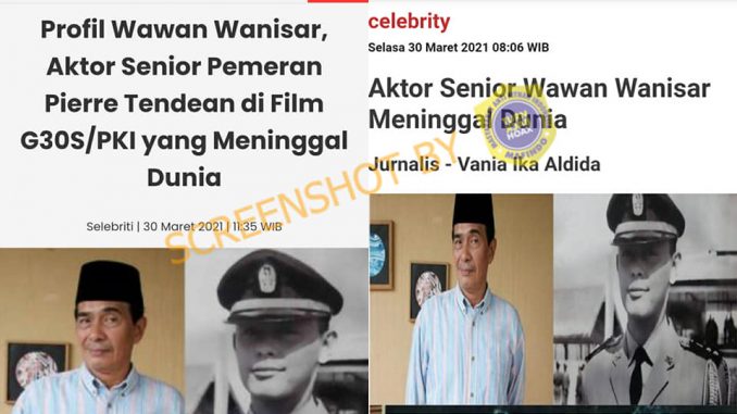“Ini bukan foto Capt. Czi. Pierre Tendean. Ini foto seorang Aktor Indonesia yang memerankan karakter Capt. Pierre dalam film G30S/PKI karya Arifin C. Noer. Almarhum Aktor hebat ink bernama populer Wawan Wanisar. Kawan seprofesi yang saya hormati. Hari ini beliau duluan pulang ke Rahmatulloh. Wawan penuh dedikasi dan bekerja. Disiplin. Selamat jalan Abang Capten. Jumpa nanti di Jannah. Insya Allah. Bismillahirrahmanirochim. Innalillahi wa innailaihi raji’uun.”