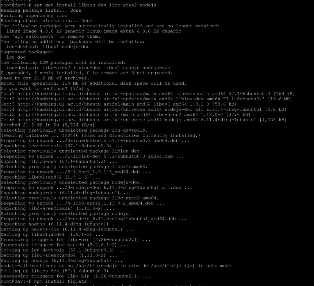 apt-get adalah salah satu tool dari apt. apt sendiri atau Advanced Packaging Tool adalah salah satu tool yang dikembangkan untuk debian based linux untuk memudahkan instalasi, seperti yum pada redhat based atau pkg pada bsd based. Pada screenshot yang dilakukan si penyebar hoax, apt sedang melakukan instalasi libicu, libc-ares, dan nodejs. Iibicu berfungsi untuk international character unicode. c-ares adalah curl ares. cURL adalah command untuk download file, dan ares adalah extension cURL untuk asynchronous request. sedangkan nodejs adalah javascript server ( https://nodejs.org/en/ )