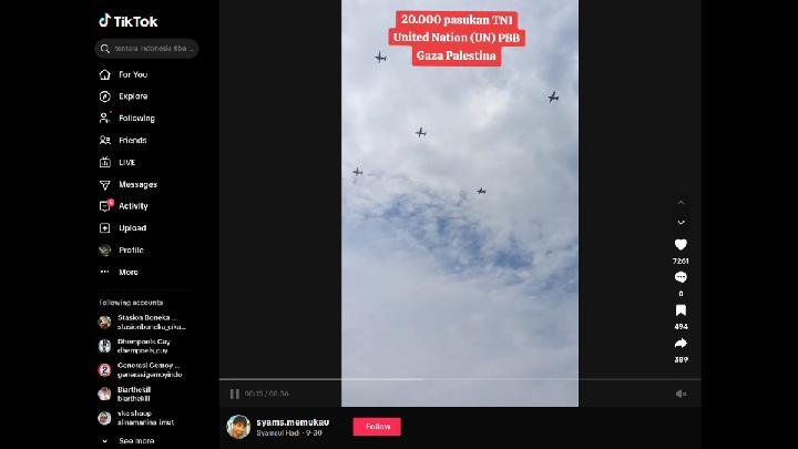 SEBUAH akun TikTok [arsip] pada 30 September 2025 mengunggah video dengan klaim bahwa 20 ribu tentara Indonesia dikirim sebagai pasukan perdamaian Perserikatan Bangsa-Bangsa ke Gaza.