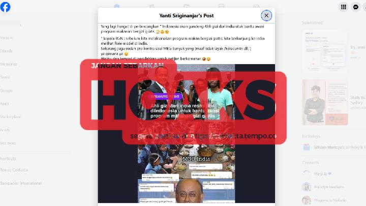 Tempo memverifikasi gambar tersebut melalui analisis manual, penelusuran di sejumlah situs kredibel, dan pemeriksaan dengan pendeteksi gambar berbasis akal imitasi (AI). Hasilnya, meski Indonesia memang berencana merekrut konsultan gizi dari India, foto yang beredar merupakan hasil buatan akal imitasi.