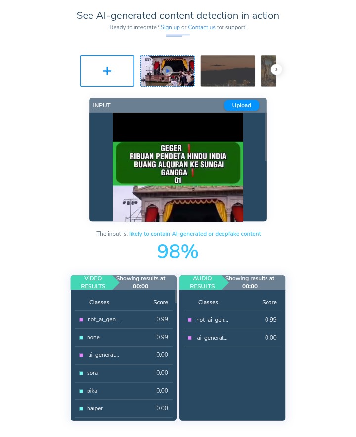 TurnBackHoax mengamati ada sejumlah kejanggalan dalam video tersebut, salah satunya di detik ke-3 saat mushaf Al-Qur’an terlempar sendiri. TurnBackHoax lalu menganalisis konten menggunakan alat pendeteksi AI, Hive Moderation. Diketahui, video merupakan hasil rekayasa kecerdasan buatan (artificial intelligence/AI), probabilitas atau kemungkinannya mencapai 98 persen.