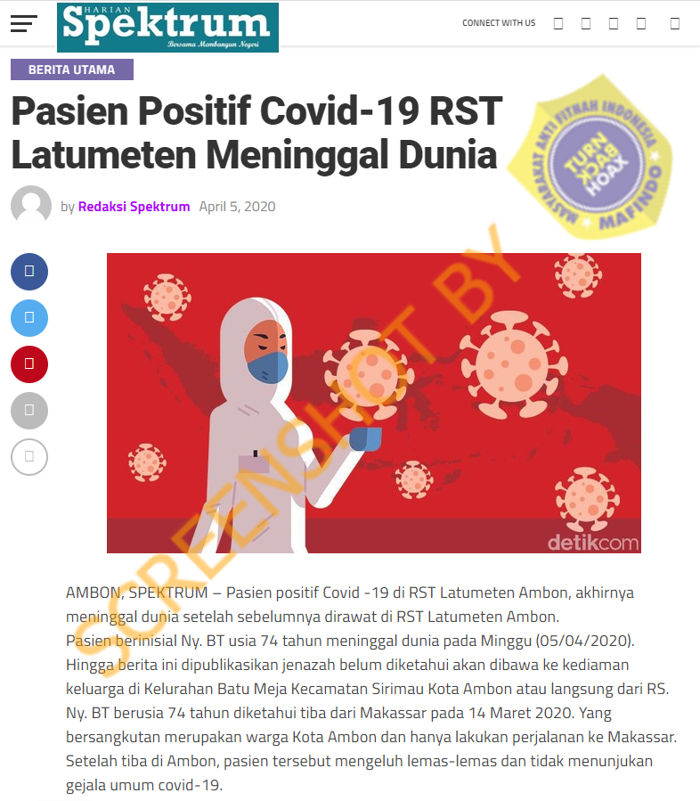 Informasi ini salah satunya dimuat di situs spektrumonline.com pada 5 April 2020 di artikel berjudul “Pasien Positif Covid-19 RST Latumeten Meninggal Dunia”